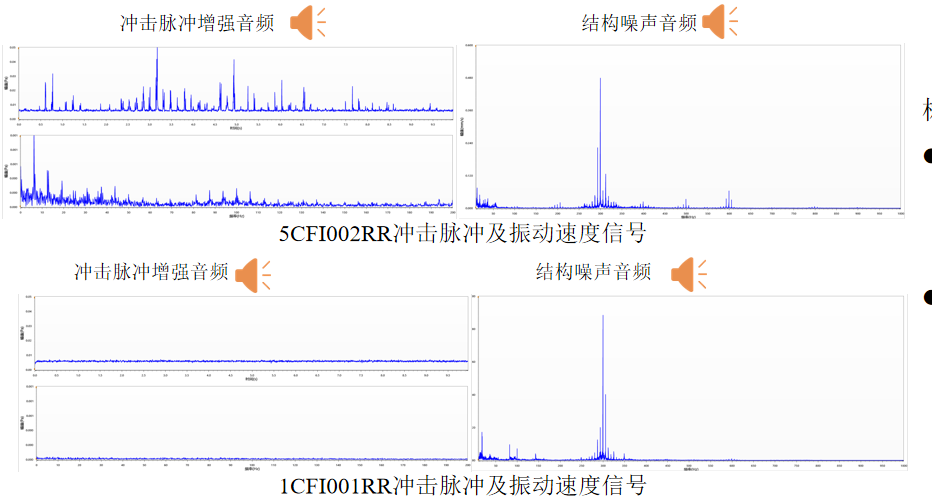 5CFI002RR冲击峰值及周期冲击能量指标值相对高出10dB以上,但振动值无明显差别;