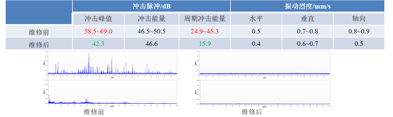 如上所示:5CFI002RR维修后,冲击脉冲指标值明显下降,且冲击脉冲信号中的涡轮蜗杆啮合冲击特征消失;振动值无明显变化,说明通过振动测试难以发现上述问题。