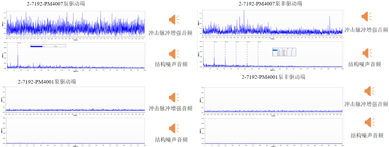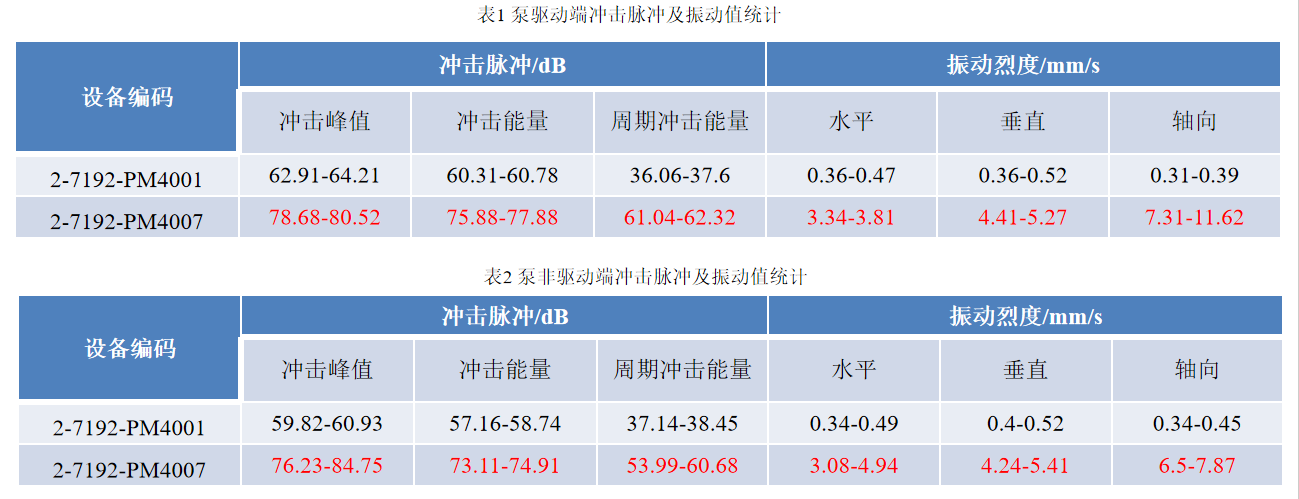 通过对比:2-7192-PM4007泵侧驱动端及非驱动端冲击脉冲指标值及振动值明显高于2-7192-PM4001,其中冲击峰值高出15dB左右;冲击能量高出15dB左右;周期冲击能量高出25dB左右。推测2-7192-PM4007泵侧运行状态异常。
